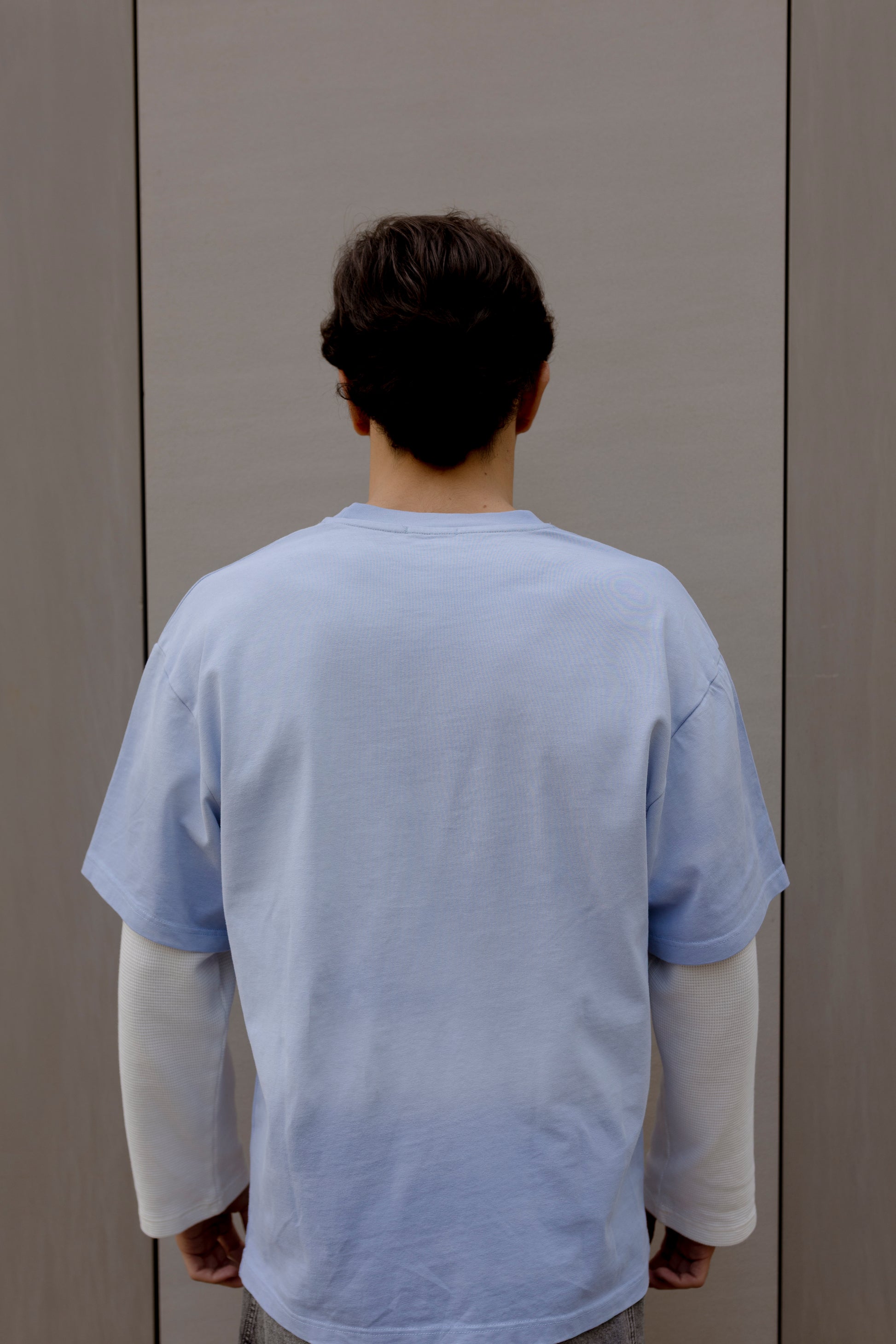 Realizzata in cotone morbido azzurro cielo, 100% Made In Italy, la t-shirt è aerografata a mano per ottenere una sfumatura unica e leggermente irregolare, che rende ogni capo diverso dall’altro.