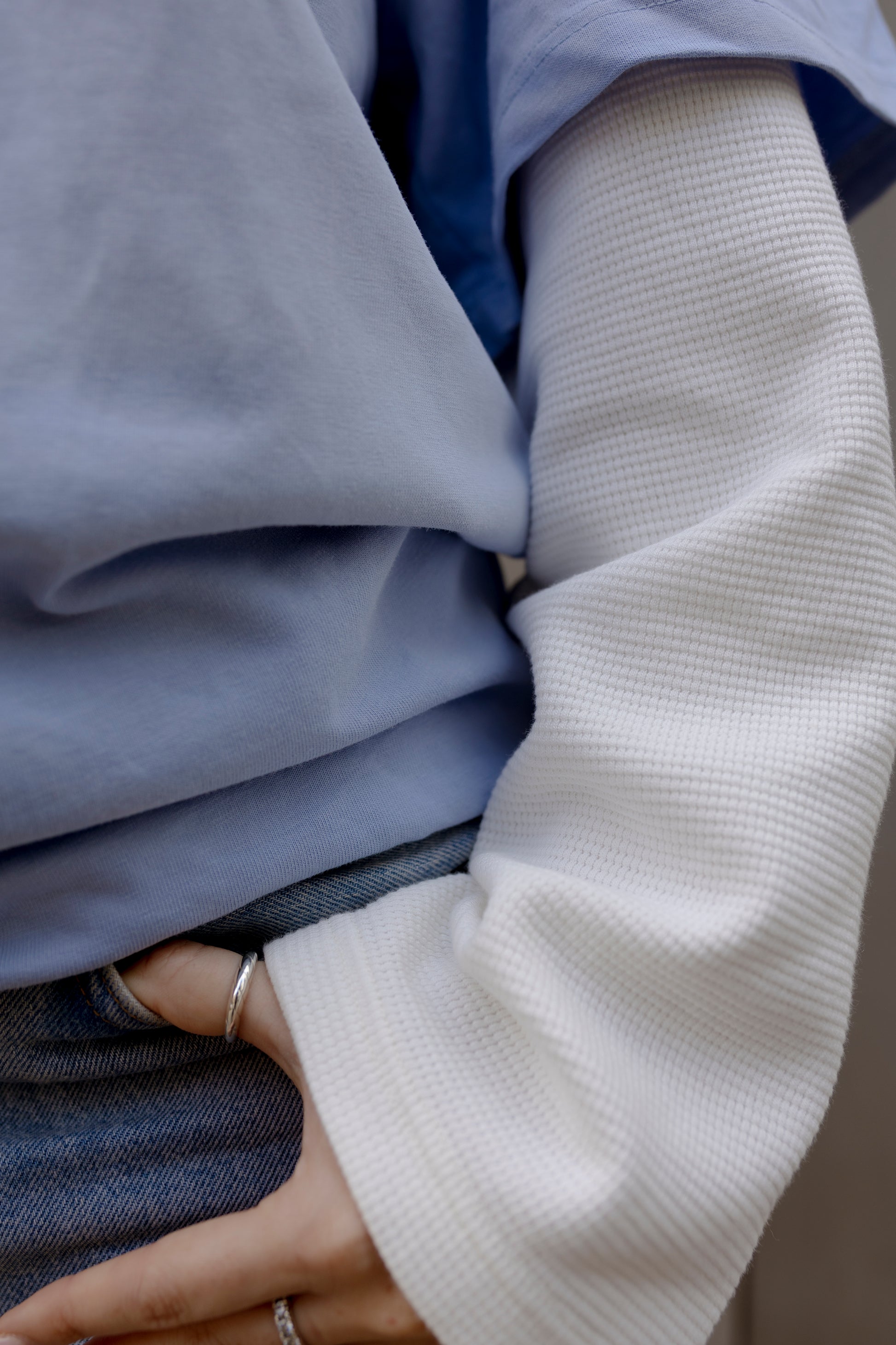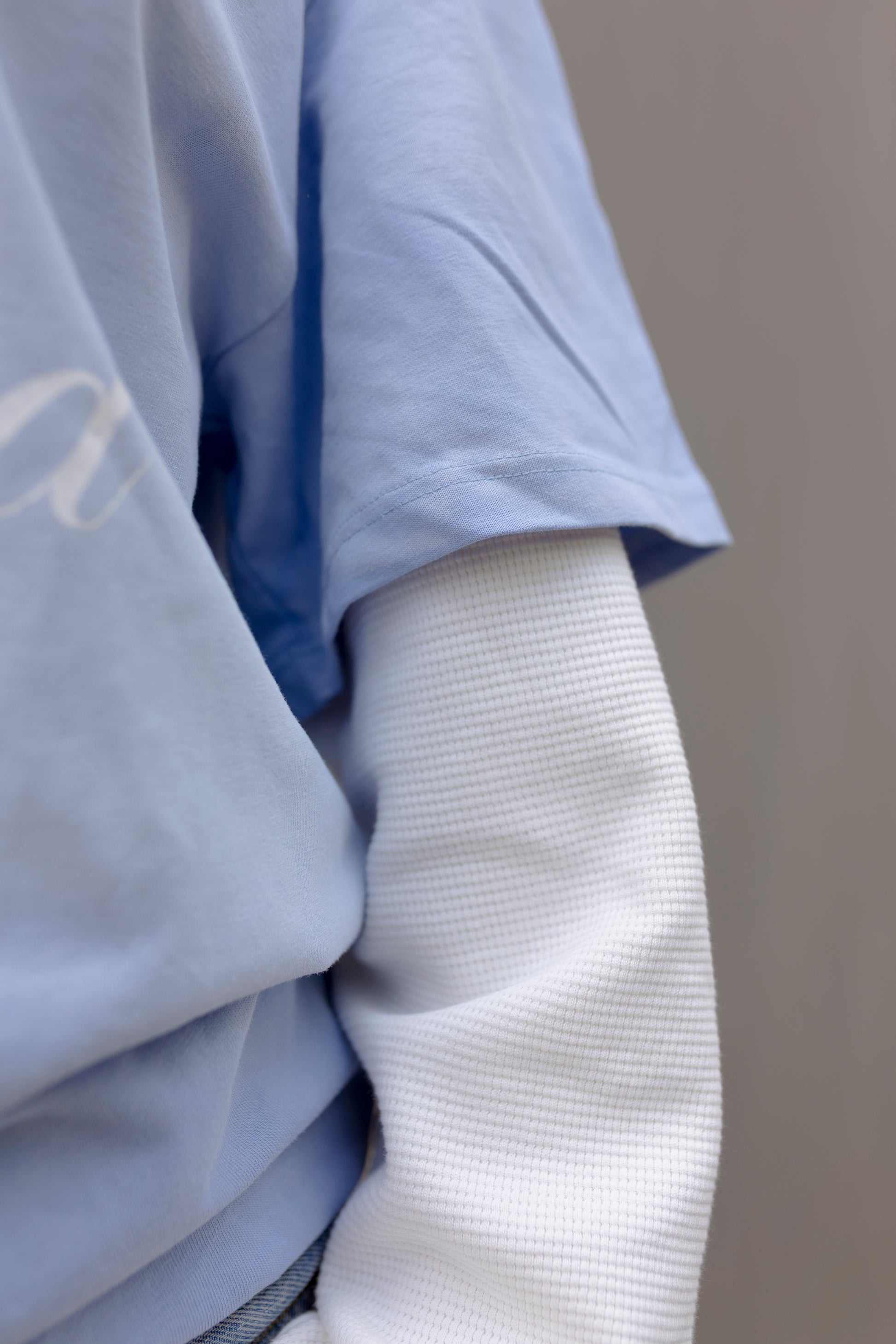 La stampa frontale vissuta esprime l’estetica autentica di Blessed Milano, mentre le maniche waffle bianche aggiungono texture e struttura.